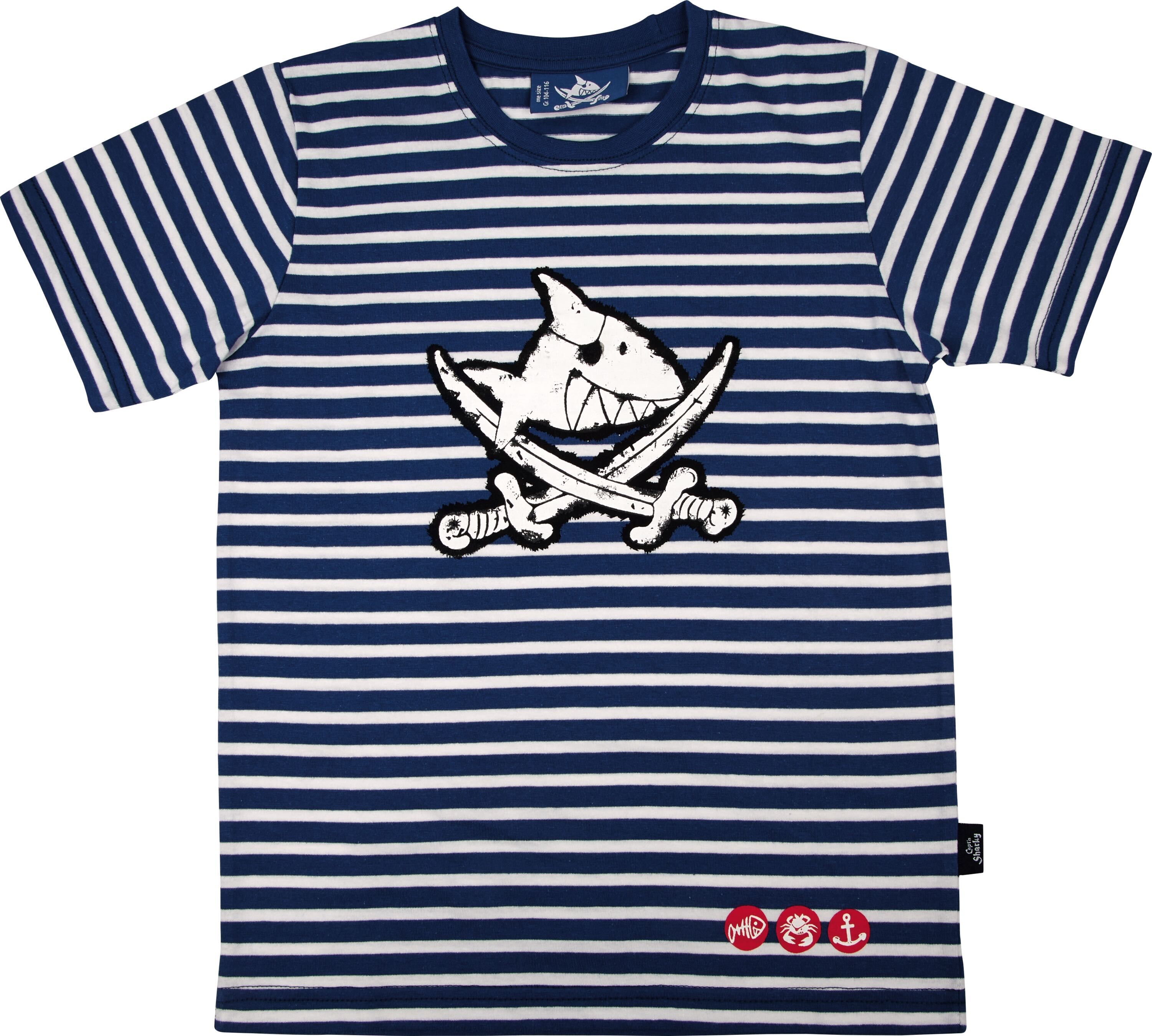 Mornarski plavo-bela prugasta majica za male morske vukove i sve koji vole da provode dane pored mora. S opasnim piratskim znakom. Jedna veličina (104/116).