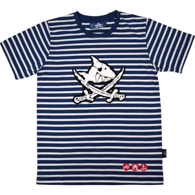 Mornarski plavo-bela prugasta majica za male morske vukove i sve koji vole da provode dane pored mora. S opasnim piratskim znakom. Jedna veličina (104/116).